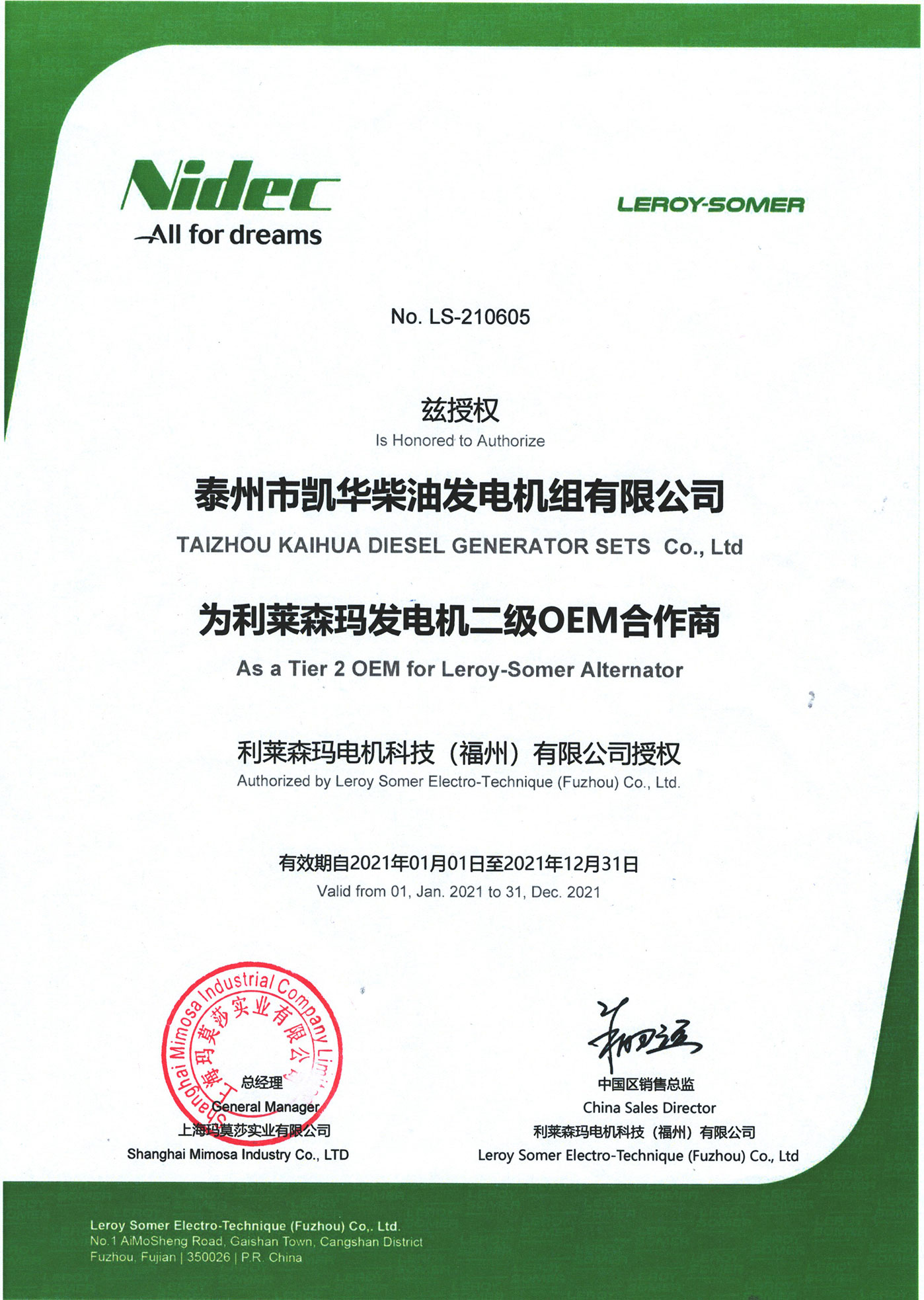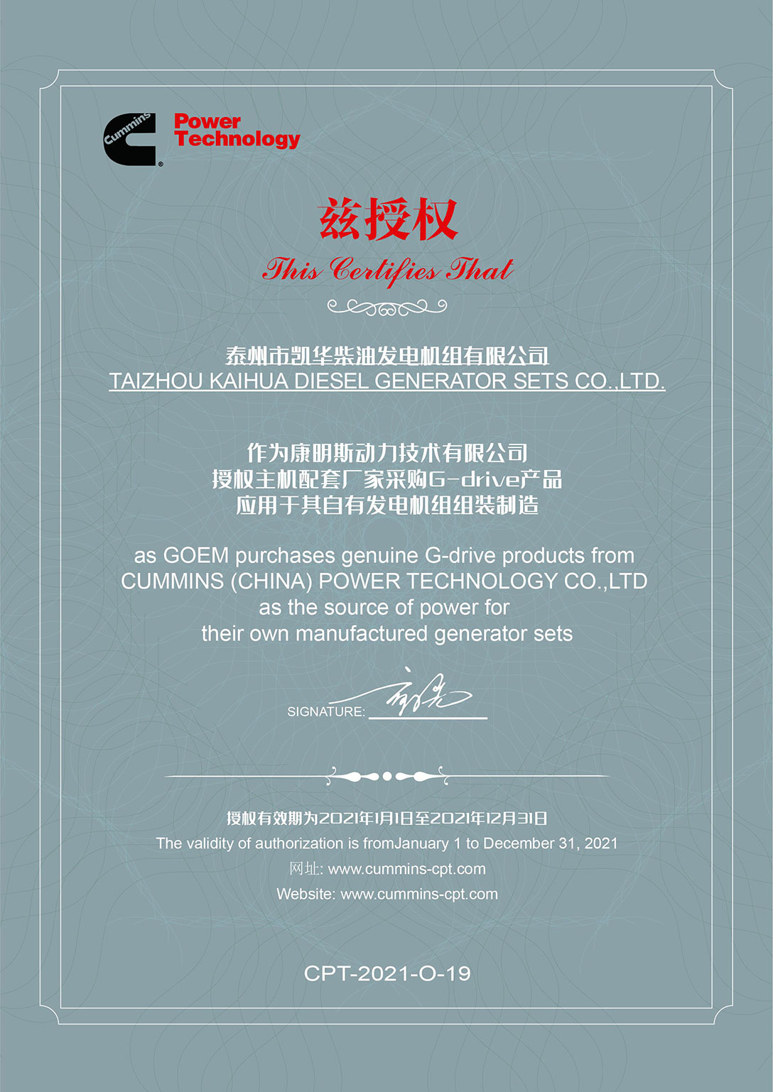 泰州市凱華柴油發(fā)電機組有限公司創(chuàng)建于2003年,是一家集柴油發(fā)電機組燃氣發(fā)電機組的研發(fā)、生產、銷售為一體的高新技術民營企業(yè),公司座落于“漢唐古郡,淮海名區(qū)”,具有“鳳凰城”美稱的祥泰之州——江蘇省泰州市,地處中國經濟最發(fā)達的長三角經濟圈,水陸空立體交通,地理位置十分優(yōu)越。公司目前注冊資本金11800萬元人民幣,生產基地占地六十畝,現有各類高素質員工一百多名,專業(yè)技術人員達46人,其中高級技術人員16人,年銷售額近6億元。 公司主營產品:3~3000KW陸用柴油發(fā)電機組,15~600KW移動拖車電站,12~1000KW船用應急柴油發(fā)電機組,各種靜音型、中高壓、多機并聯(lián)、燃氣等特種機組以及進口系列柴油發(fā)電機組,可滿足不同客戶的一切電力需求,還可滿足用戶不同電壓、不同頻率的要求。凱華公司是康明斯品牌的授權代理商,專業(yè)生產供應康明斯柴油發(fā)電機組。